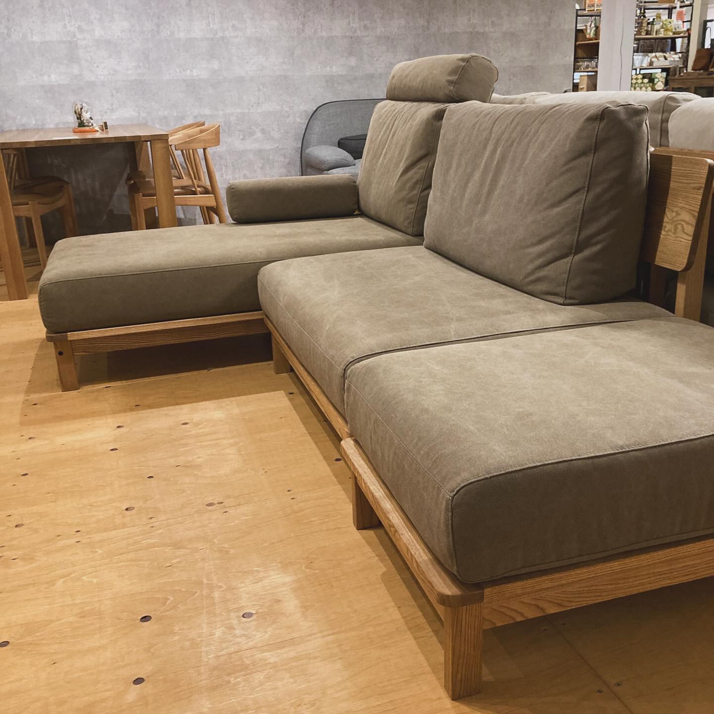 帆布生地を使用した厚めのクッションにアッシュ無垢材を使用。